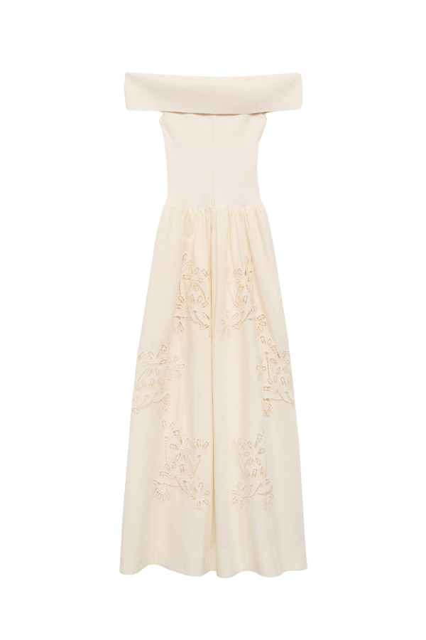 Dressed in beige and brown, under the stars — an off-shoulder dress that whispers elegance, paired with earthy details for a perfect al fresco evening.